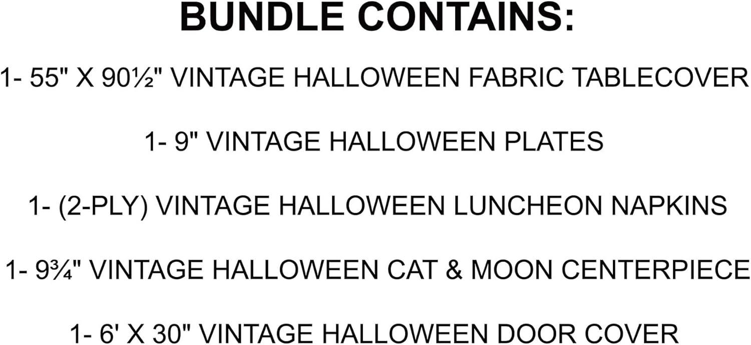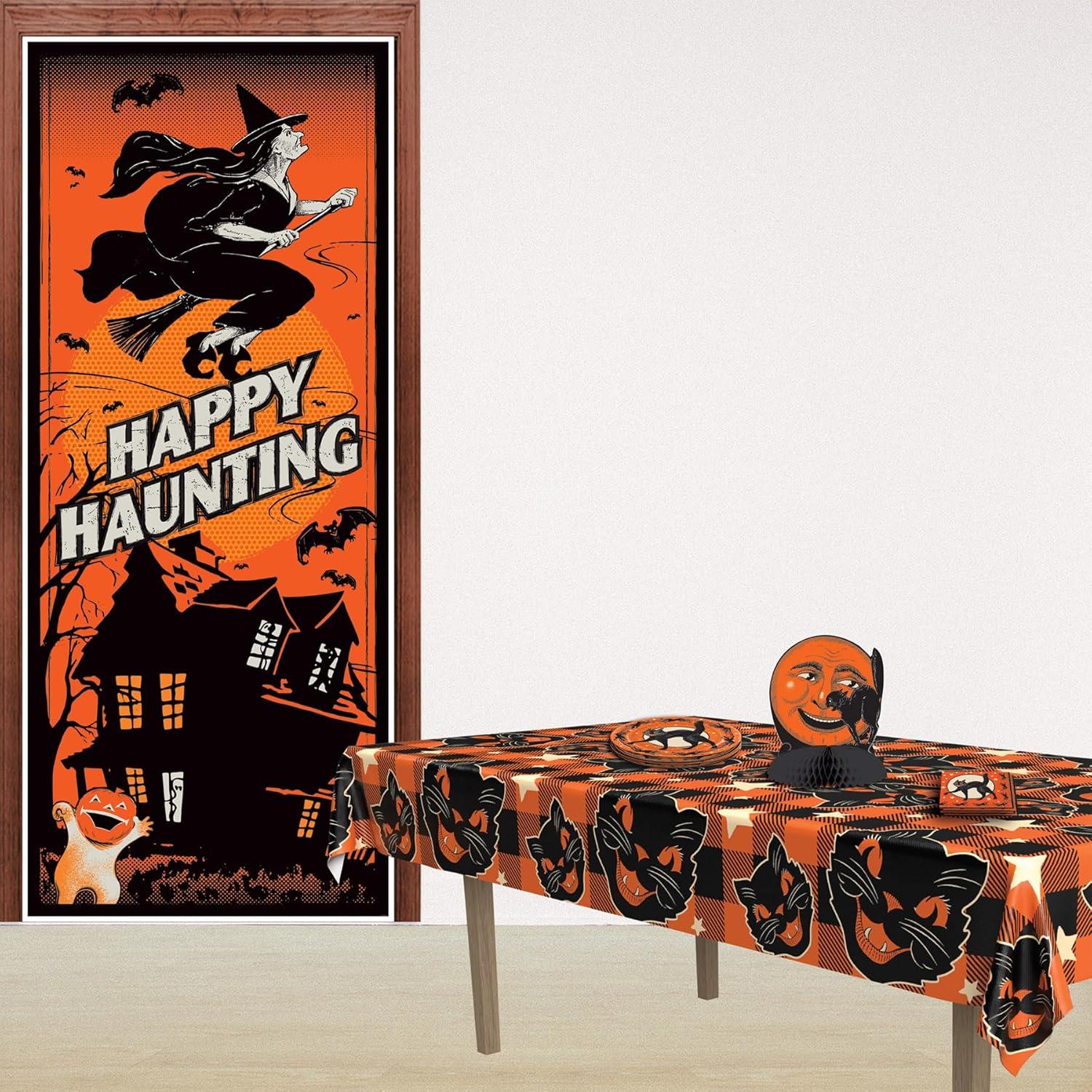 Beistle Vintage Halloween Tablecover, 8 Piece Vintage Halloween Plates, 16 Piece Vintage Halloween Napkins, Vintage Halloween Cat & Moon Centerpiece, 2 Piece Vintage Halloween Door Covers