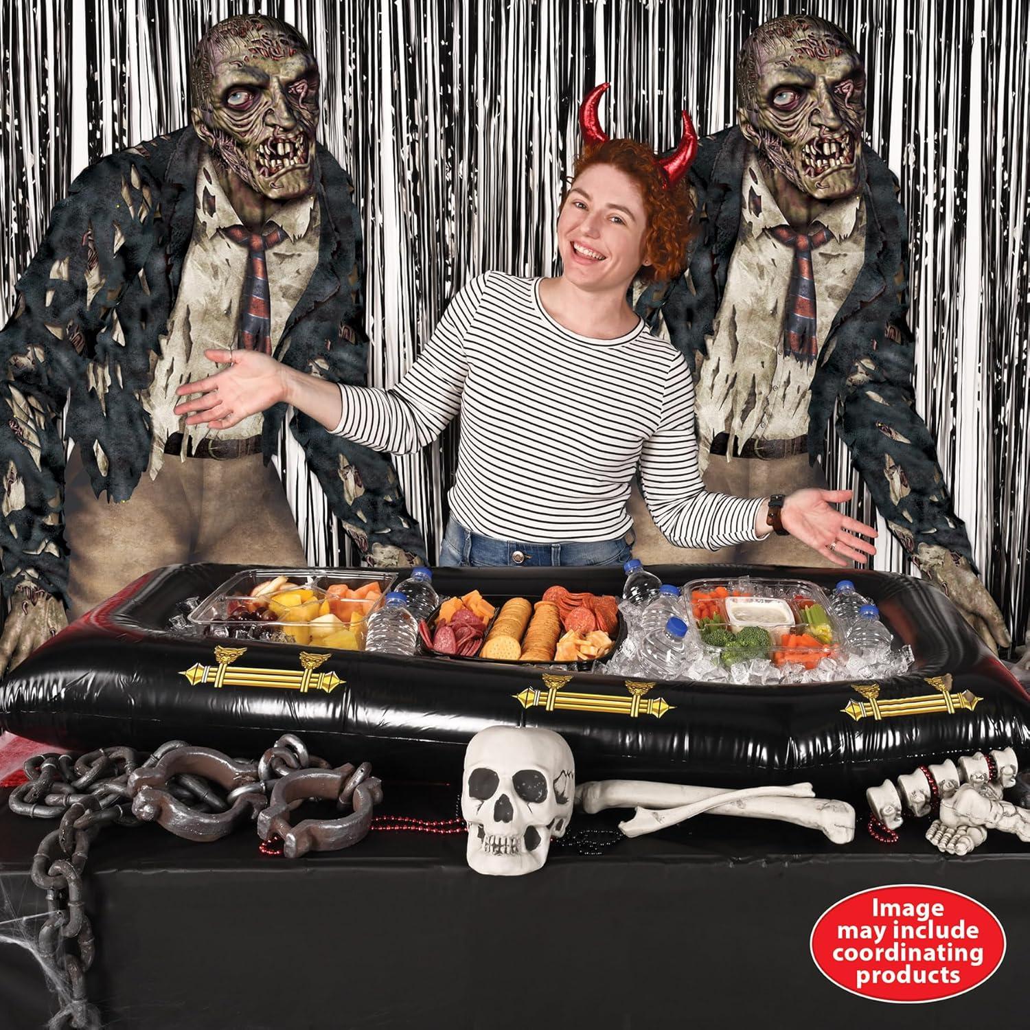 Beistle Spooky Season Halloween Party Bundle – Inflatable Coffin Buffet Cooler, 2 Piece Zombie Figure Photo Prop Backdrops