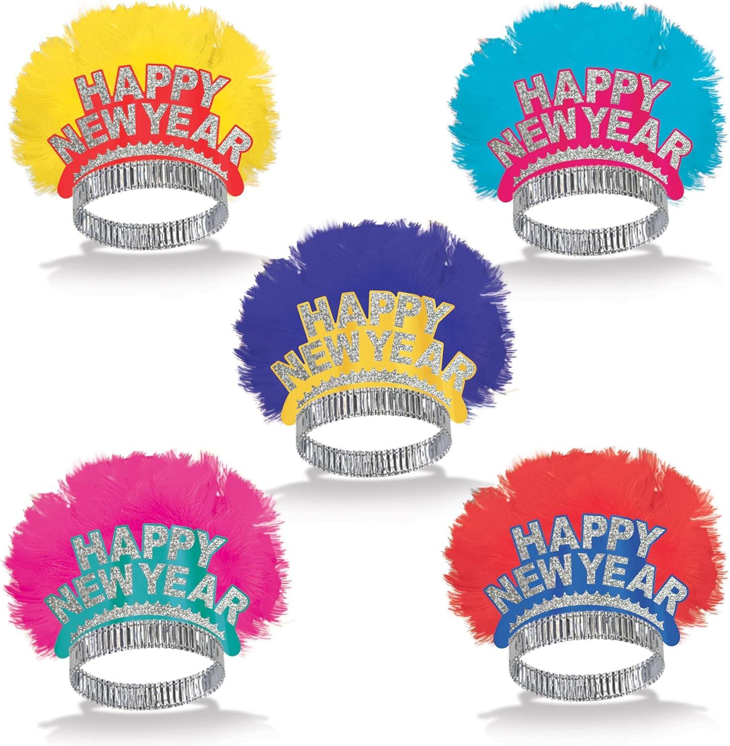 Beistle 50-Person Happy New Year Bird of Paradise Sparkly Tiaras, Multicolor Feathered Headdresses for New Year’s Eve Celebrations, NYE Party Accessories(Assorted)