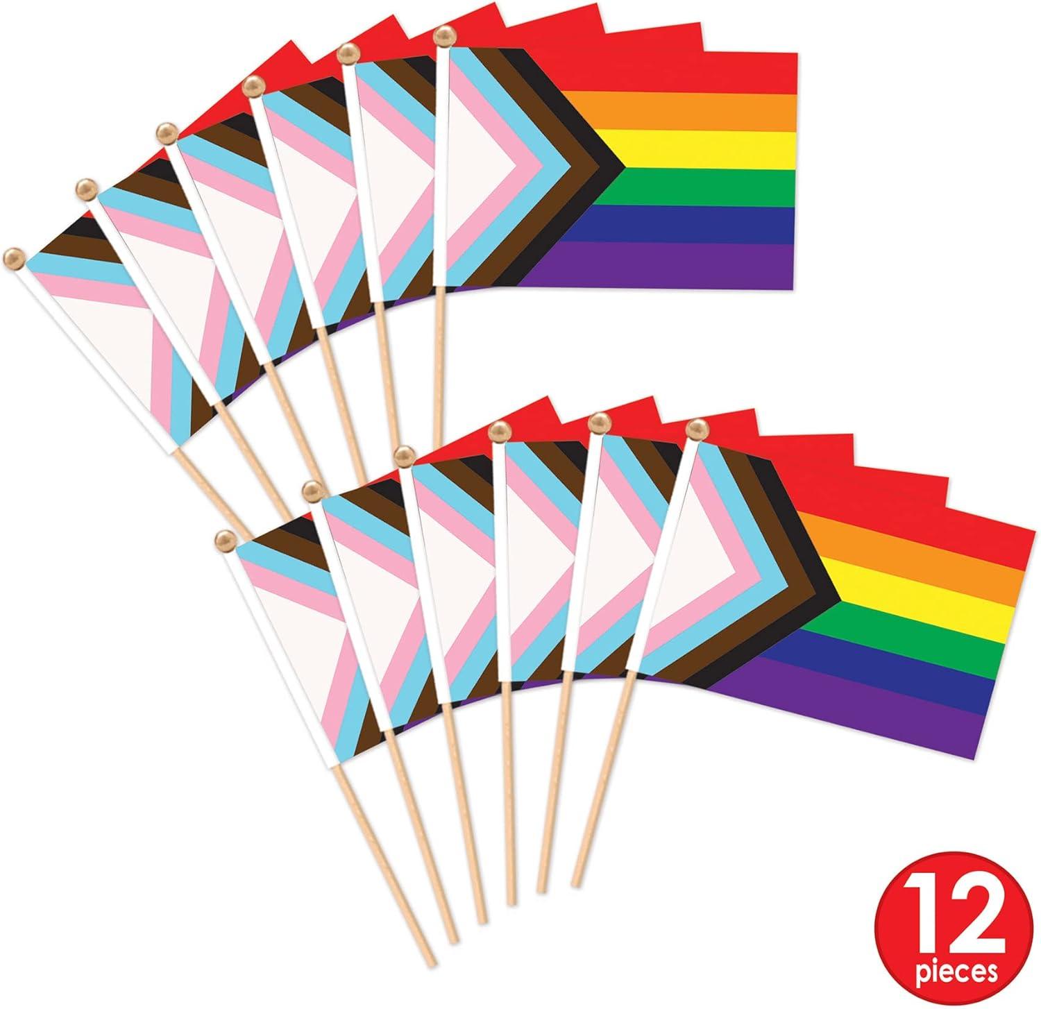 Beistle 12 Piece Polyester Fabric Rainbow Pride Flags With Wooden Sticks LBGTQ Party Decorations