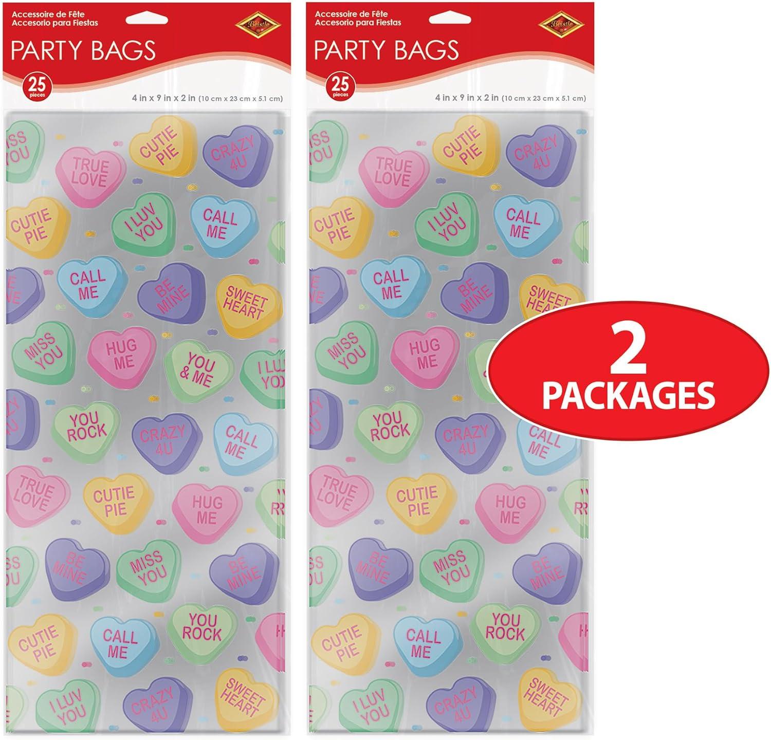 Beistle 50 Piece Candy Heart Valentine’s Day Cellophane Bags, Plastic Cello Treat Holders, Twist Ties Included, Celebrating With You Since 1900