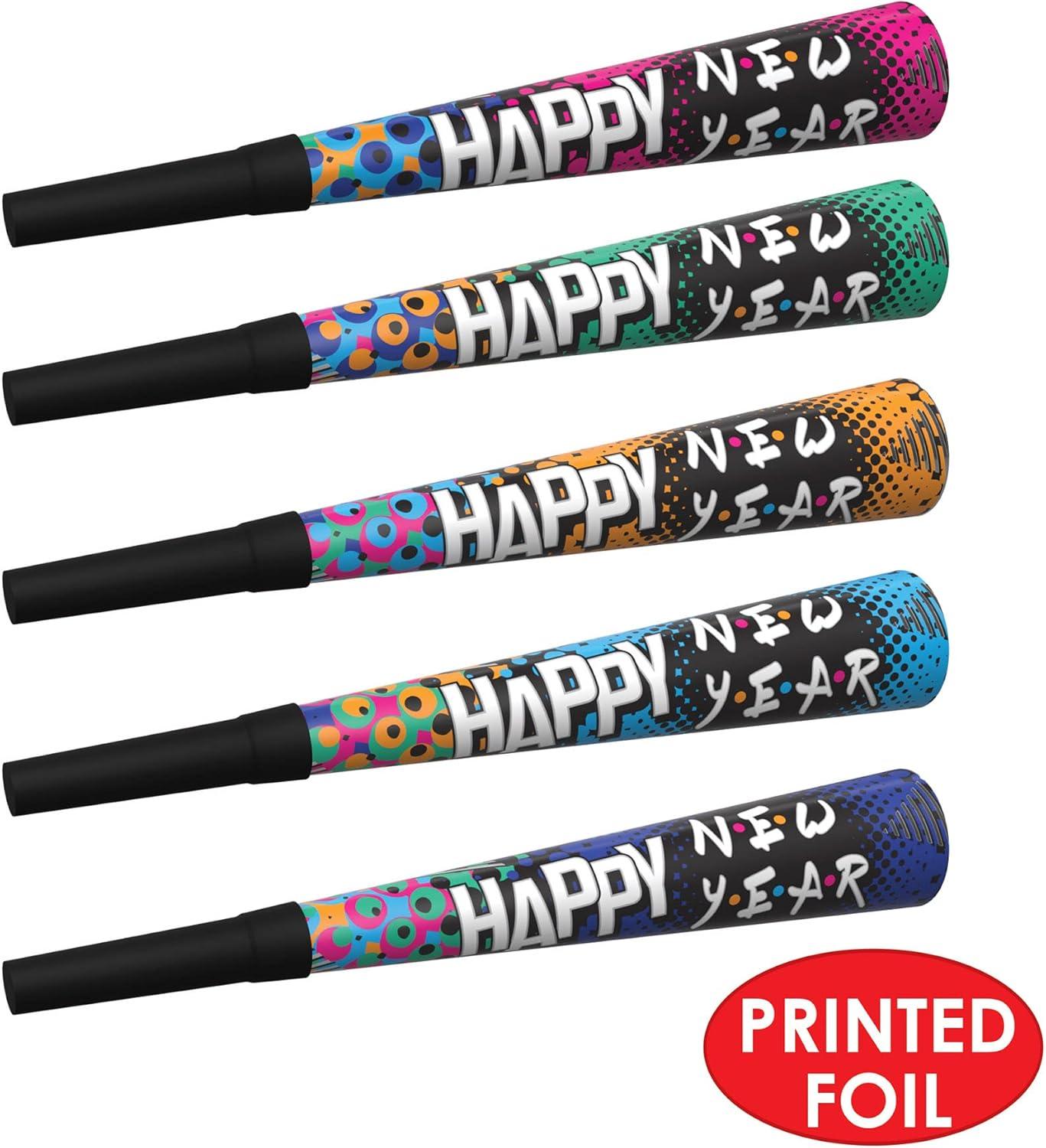 Blast back to the 1990s with Beistle 90’s New Year’s Party Horns—a rad way to bring in the New Year with throwback flair! This 100-count party horn set is all that and a bag of chips, featuring bright, bold colors straight out of the 90s. You'll get a mix of pink, teal, yellow, blue, and green designs with retro “Happy New Year” graphics and sleek black plastic mouthpieces for easy, stylish noisemaking.