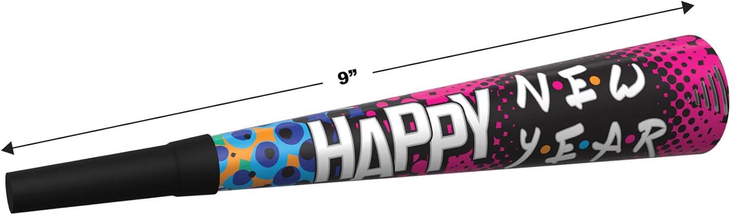 Each horn measures 9 inches long and is made of high-quality printed cardstock with a sturdy plastic tip. Perfect for large gatherings, countdown parties, and throwback dance floors, these party horns will have your crew buzzing with excitement all night long. Whether you're recreating a 90s NYE vibe, adding color to your party, or just need a blast of nostalgia, this set is guaranteed to pump up the jam. Intended for adult use only.