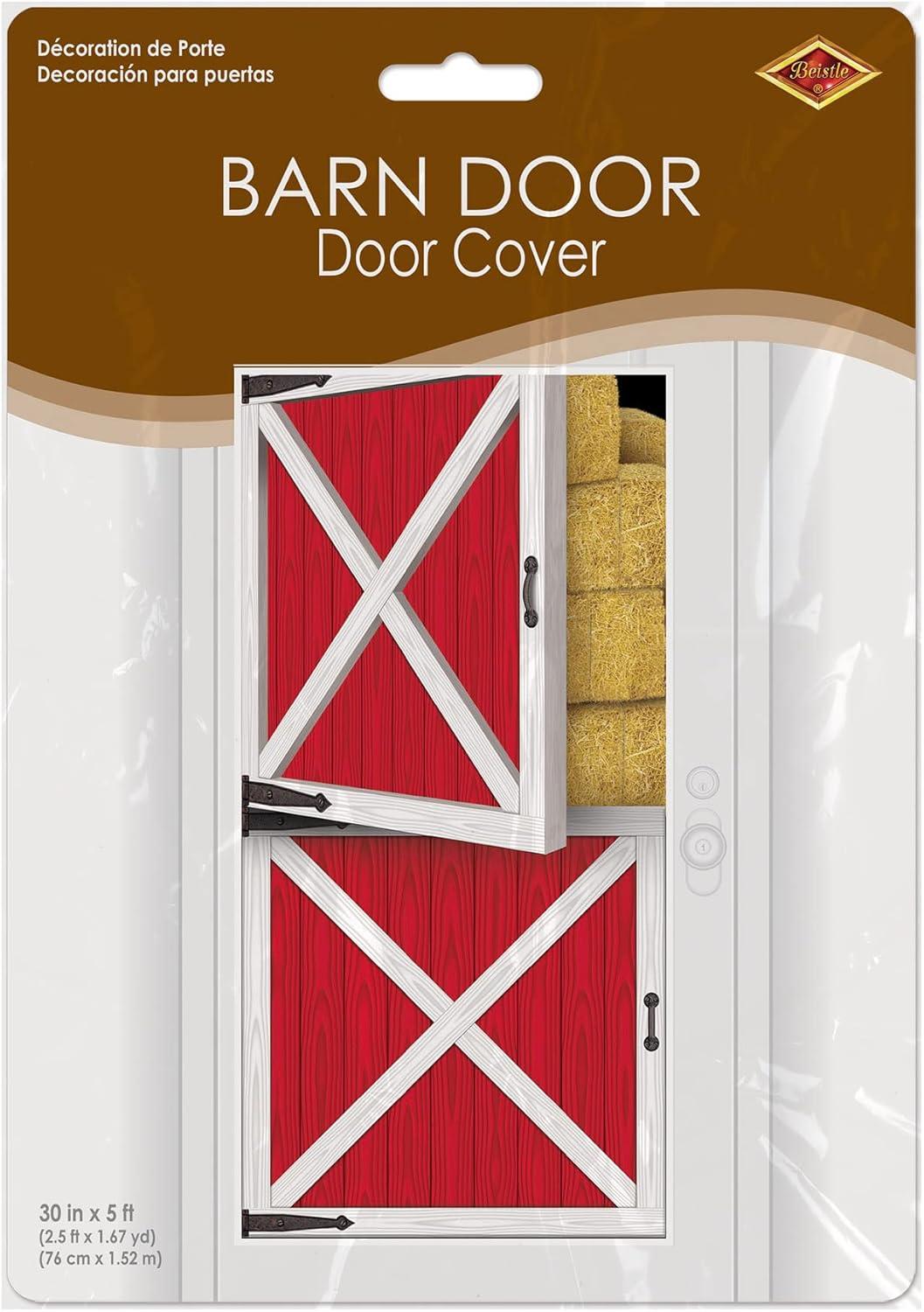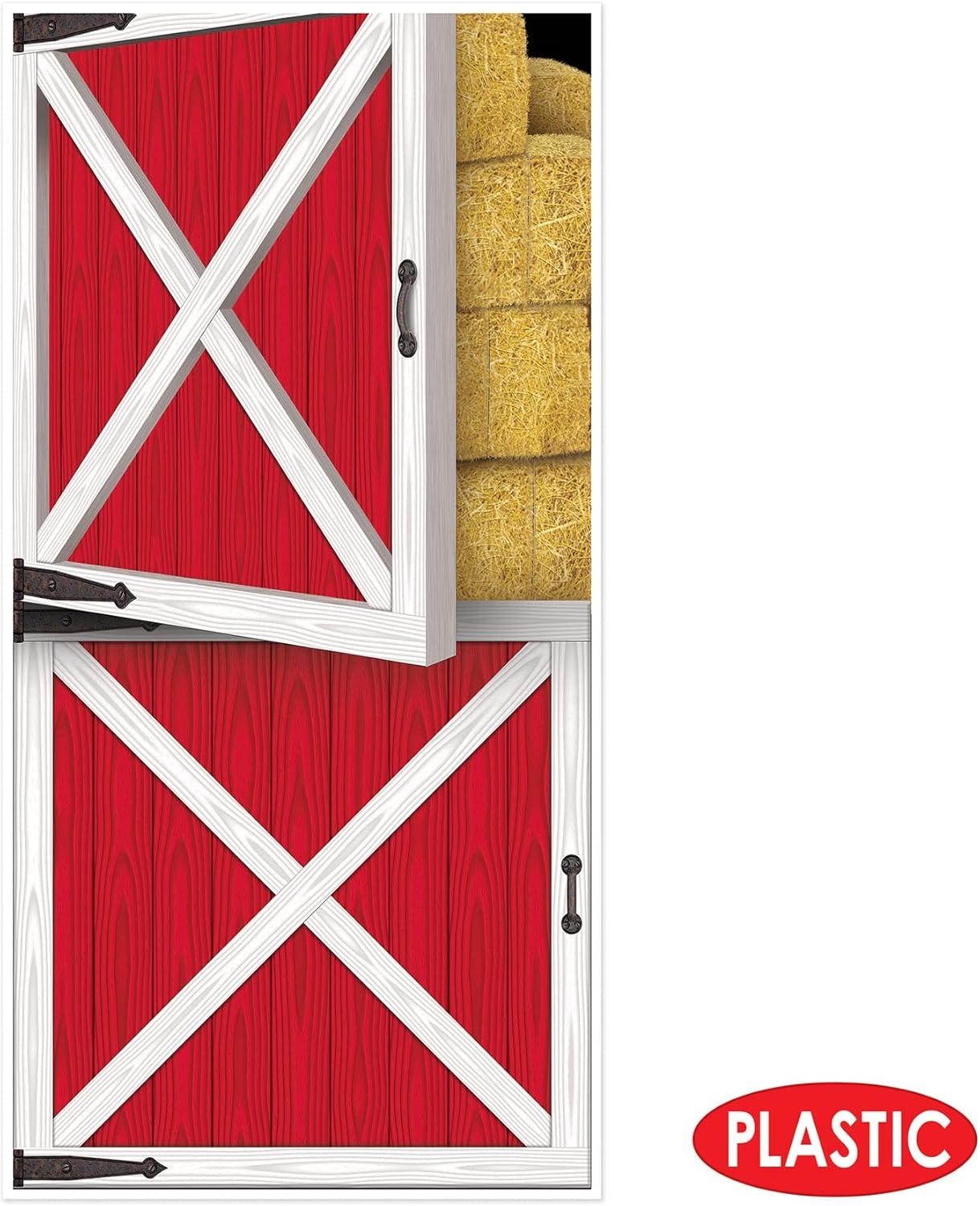 Turn any door into a Barn Door with this novelty party decoration! The Barn Door Cover is made of printed thin plastic and can be used indoors or outdoors. It measures 30 Inches wide by 5 feet tall. The door cover is created to look like a wooden Red barn door with white wooden trim, black hardware with the top portion partially open to reveal haybales. Hang this Barn Door Cover on your door for a western themed party, Barnyard Celebration or Farm Themed party!