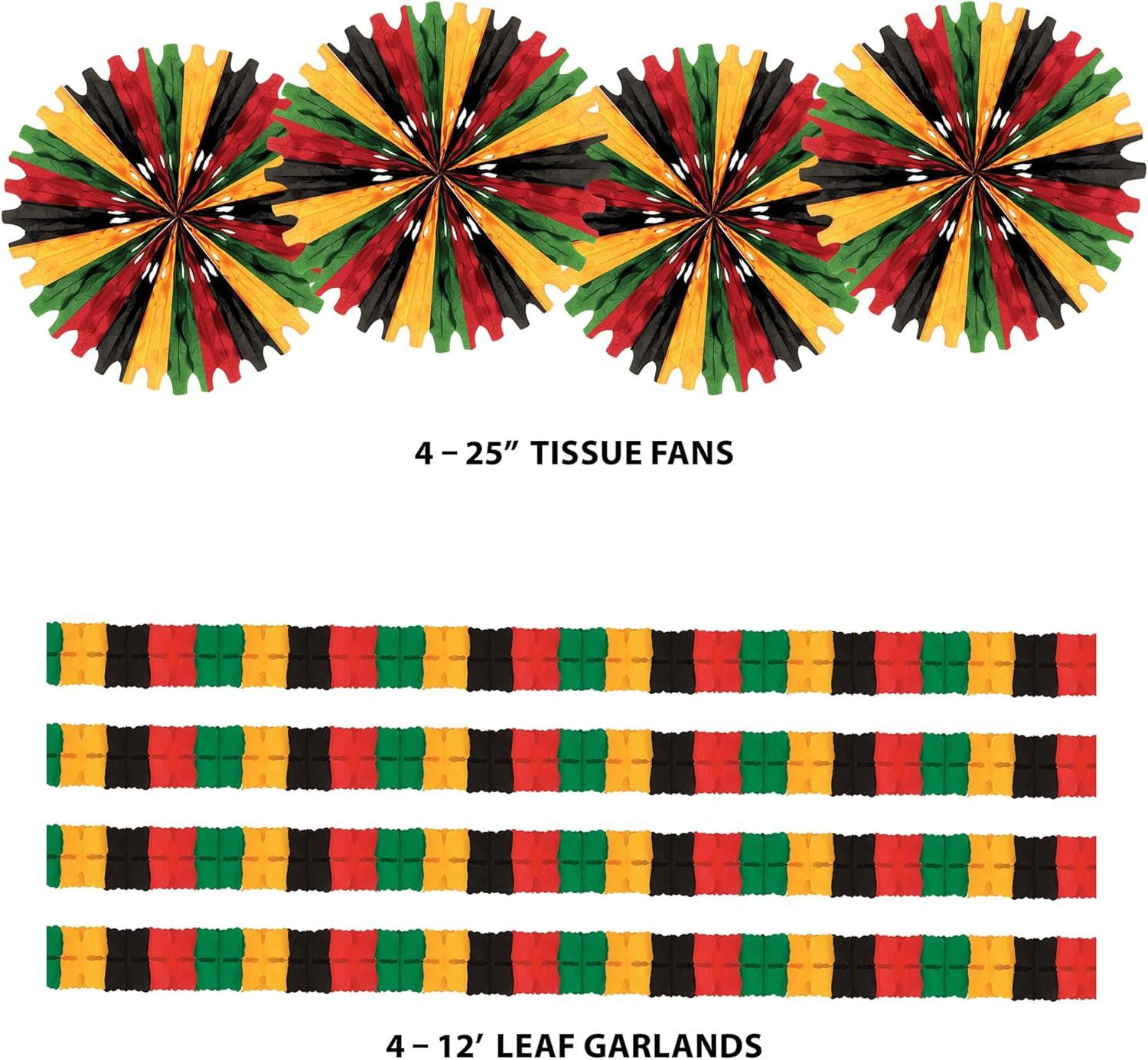 Beistle Celebrate History Decorating Kit 18-Piece Set with Tissue Fans, Cutouts, Streamer, and Leaf Garlands, Red, Green, Yellow and Black African American Party Supplies, Assorted, YellowBlack