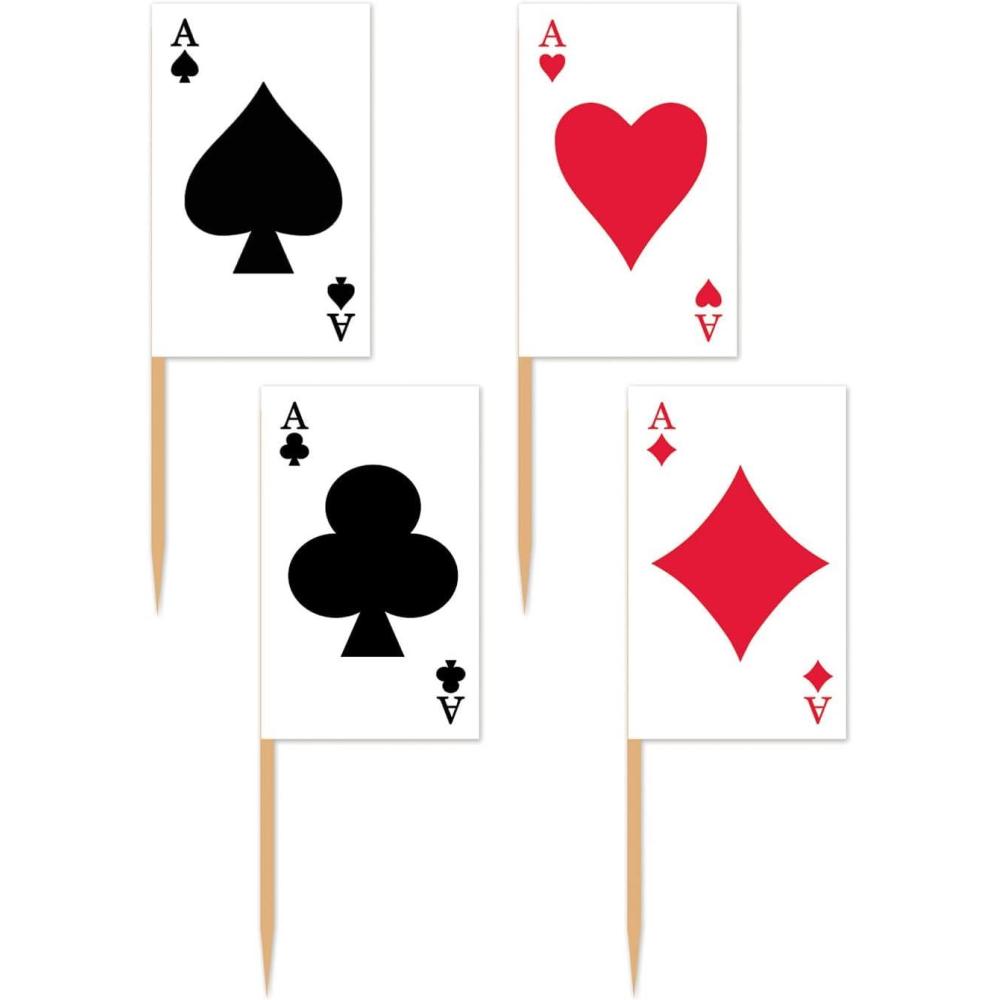 Beistle 60099 Playing Card Picks (50 Count). These little playing card picks are a must have at your casino themed party! Use them for finger foods or stick them in cupcakes. They are shaped like playing cards in assorted designs of the ace of clubs, diamonds, hearts and spades and have a red and white checkered back design. The picks are 21/2 Inch tall.