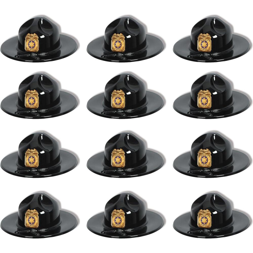 Beistle S66790AZ12 Black Plastic Trooper Hats. The package contains 12 trooper hats. They are made of black plastic and have paper shields attached. These hats are one size fits most. Use them for fire prevention awareness!