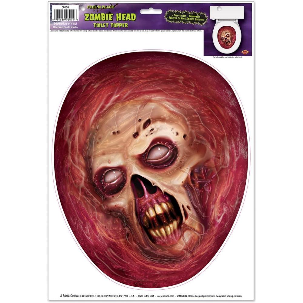 Beistle 00136 Zombie Head Toilet Topper Peel 'N Place. The sheet contains 1 toilet topper printed with a scary looking zombie head. The sheet measures 12 inches wide by 17 inches tall. The peel 'n place measures approximately 13.5 inches tall by 11.25 inches wide. Decorate your bathroom with this great toilet topper peel 'n place.