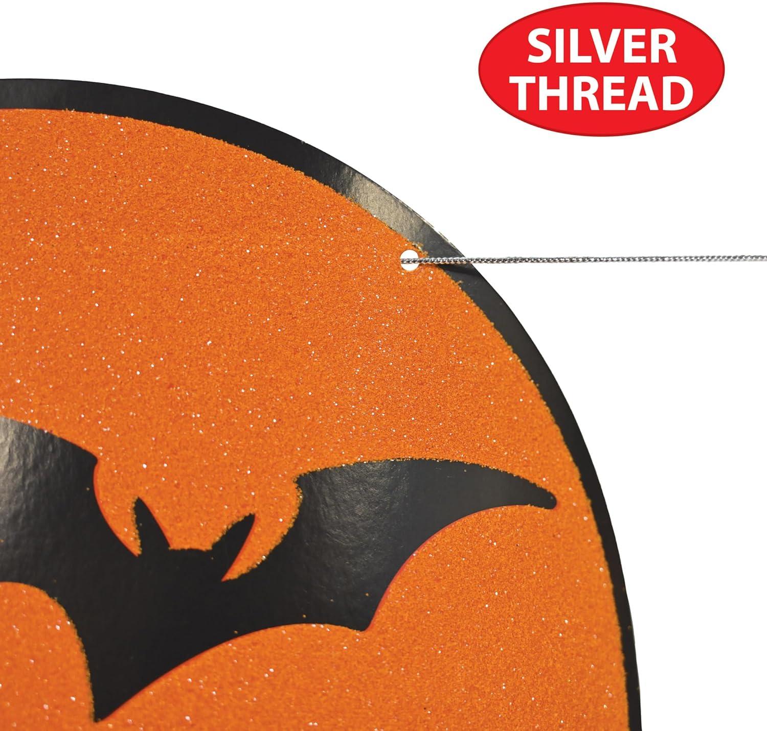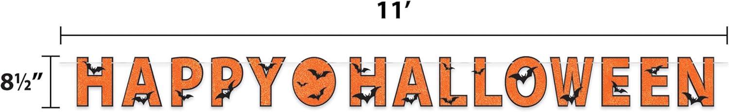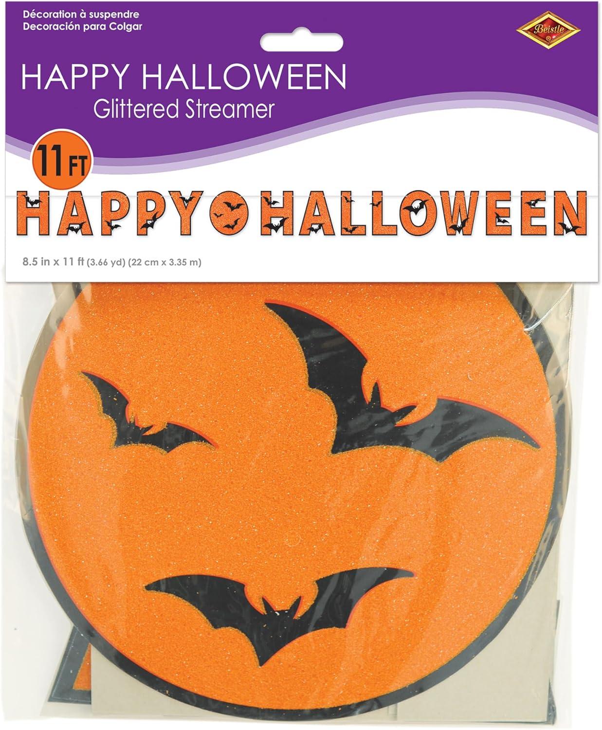 Beistle 01022 Glittered Happy Halloween Streamer is made of black foil letters with orange glitter on a silver cord. There are black bats throughout the letters. It is made of cardstock and is 81/2 Inch tall by 11 feet wide.