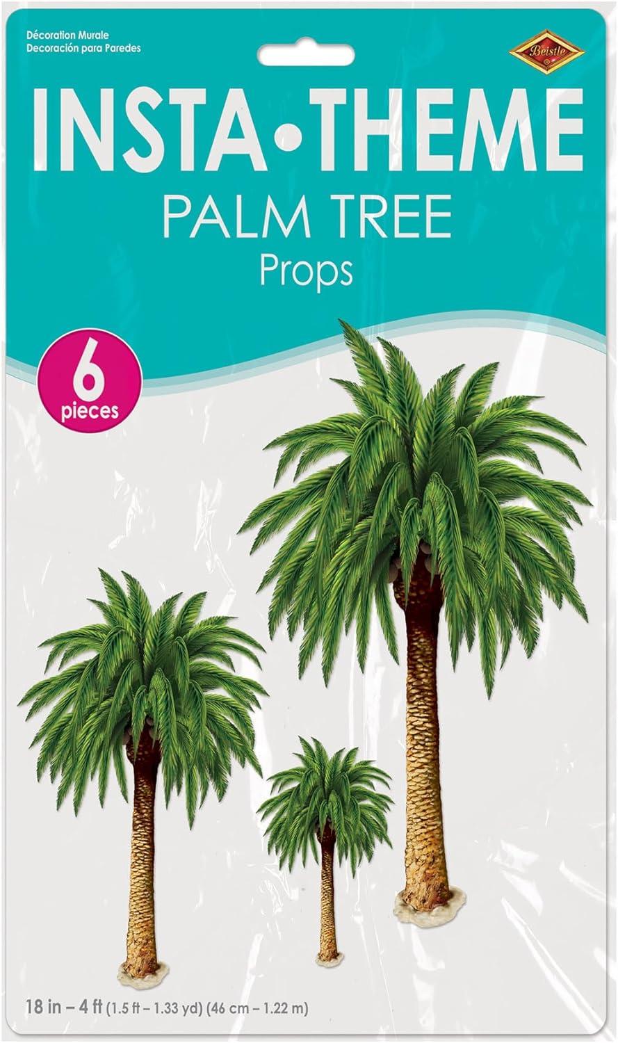 Beistle 52005 Palm Tree Props. The package includes 6 plastic palm trees that range in size from 18 inches tall to 4 feet tall. They are printed on thin clear plastic. Props are not free-standing. They are printed on thin plastic material to be cut apart and attached to walls. Great to go along with the plastic backdrops.